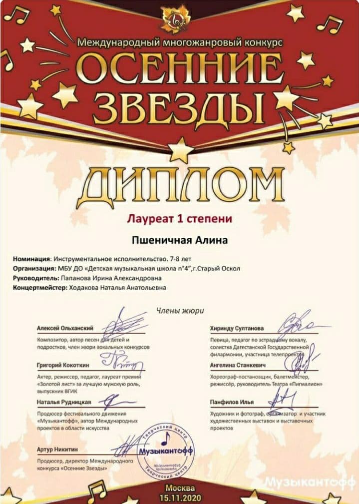15 ноября состоялся Международный многожанровый конкурс «Осенние звезды». Поздравляем учащихся с присвоением звания Лауреатов. Лауреат I степени Бунина Вера (преп. Папанова И.А., конц. Ходакова Н.А.) Пшеничная Алина (преп. Папанова И.А., конц. Ходакова Н.А.)