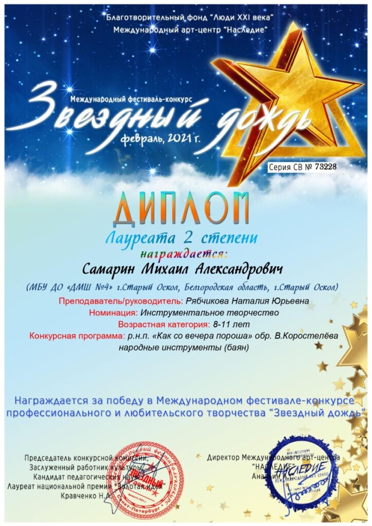 В феврале состоялся Международный фестиваль-конкурс «Звездный дождь» (г. Санкт-Петербург). В нем принял участие учащийся народного отделения Самарин Михаил (преп. Рябчикова Н.Ю.) и стал лауреатом II степени.