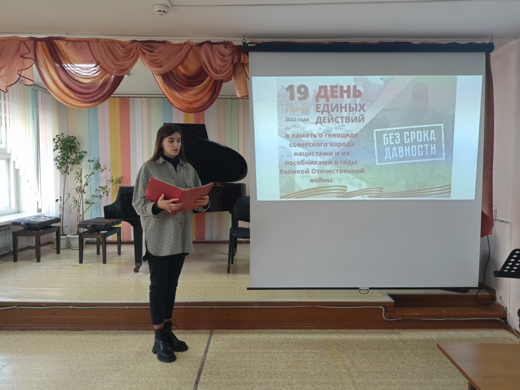 Ежегодно 19 апреля во всех образовательных организациях России проводится День единых действий в память о геноциде советского народа нацистами и их пособниками в годы Великой Отечественной войны 1941–1945 годов. В актовом зале нашего учреждения преподаватели провели лекцию, приуроченную к этому дню, на которой рассказали учащимся об исторических событиях и действиях советского […]