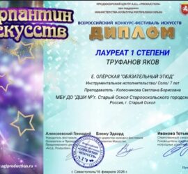 В городе Севастополе прошел Всероссийский конкурс-фестиваль искусств «Серпантин искусств». Лауреат I степени:Труфанов Яков (преп. Колесникова С. Б.). Поздравляем преподавателя и юного музыканта с отличным результатом!