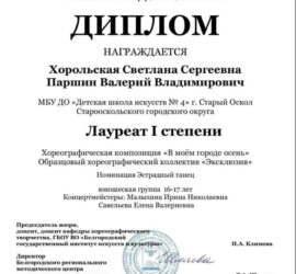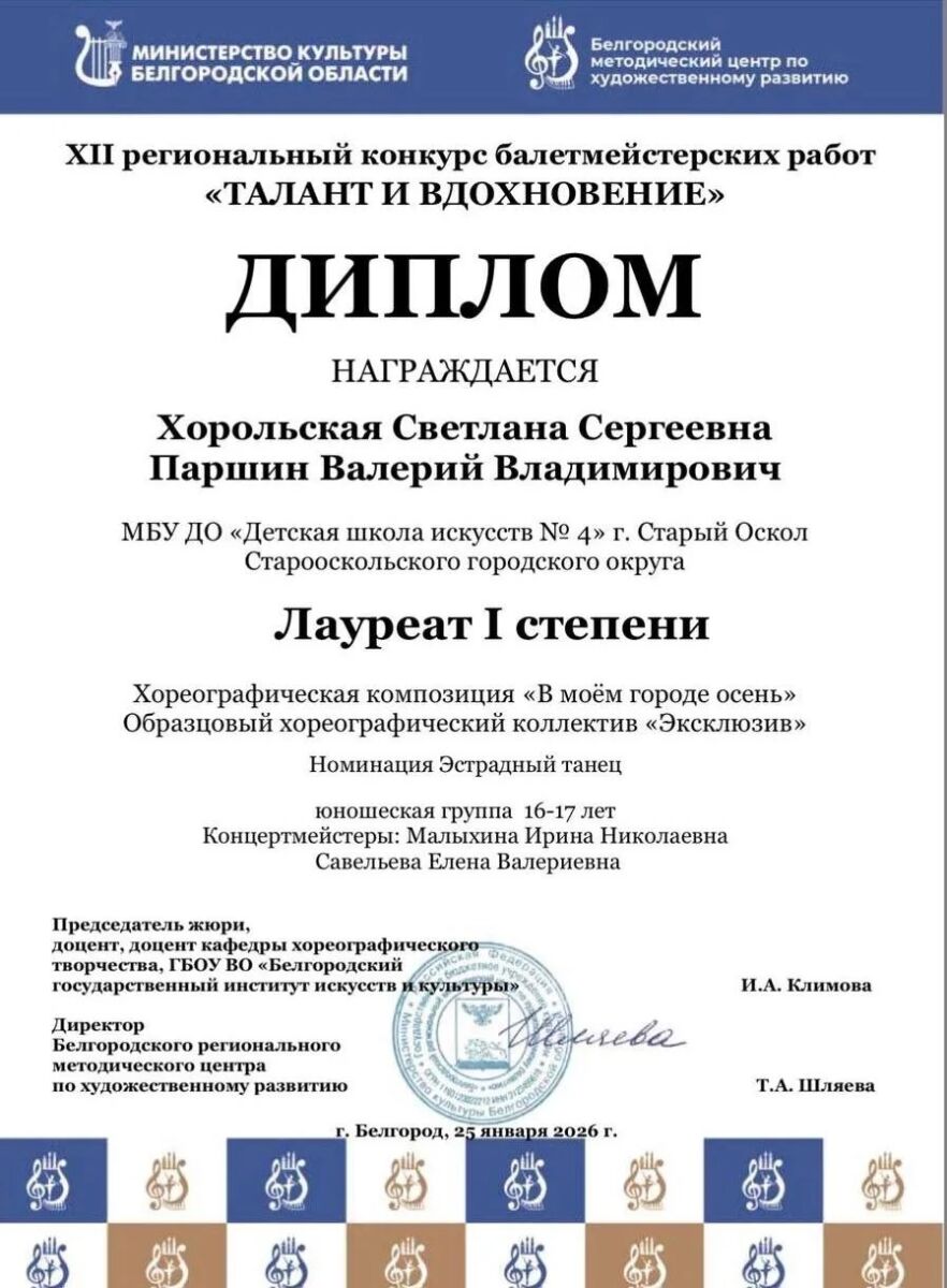 Поздравляем наших талантливых балетмейстеров, руководителей образцового хореографического коллектива «Эксклюзив» — Хорольскую С. С. и Паршина В. В. — с блестящими результатами на региональном конкурсе «Талант и вдохновение»! По решению жюри были присуждены: три диплома лауреата I степени и один диплом лауреата II степени. Пусть каждый новый проект будет ещё смелее […]