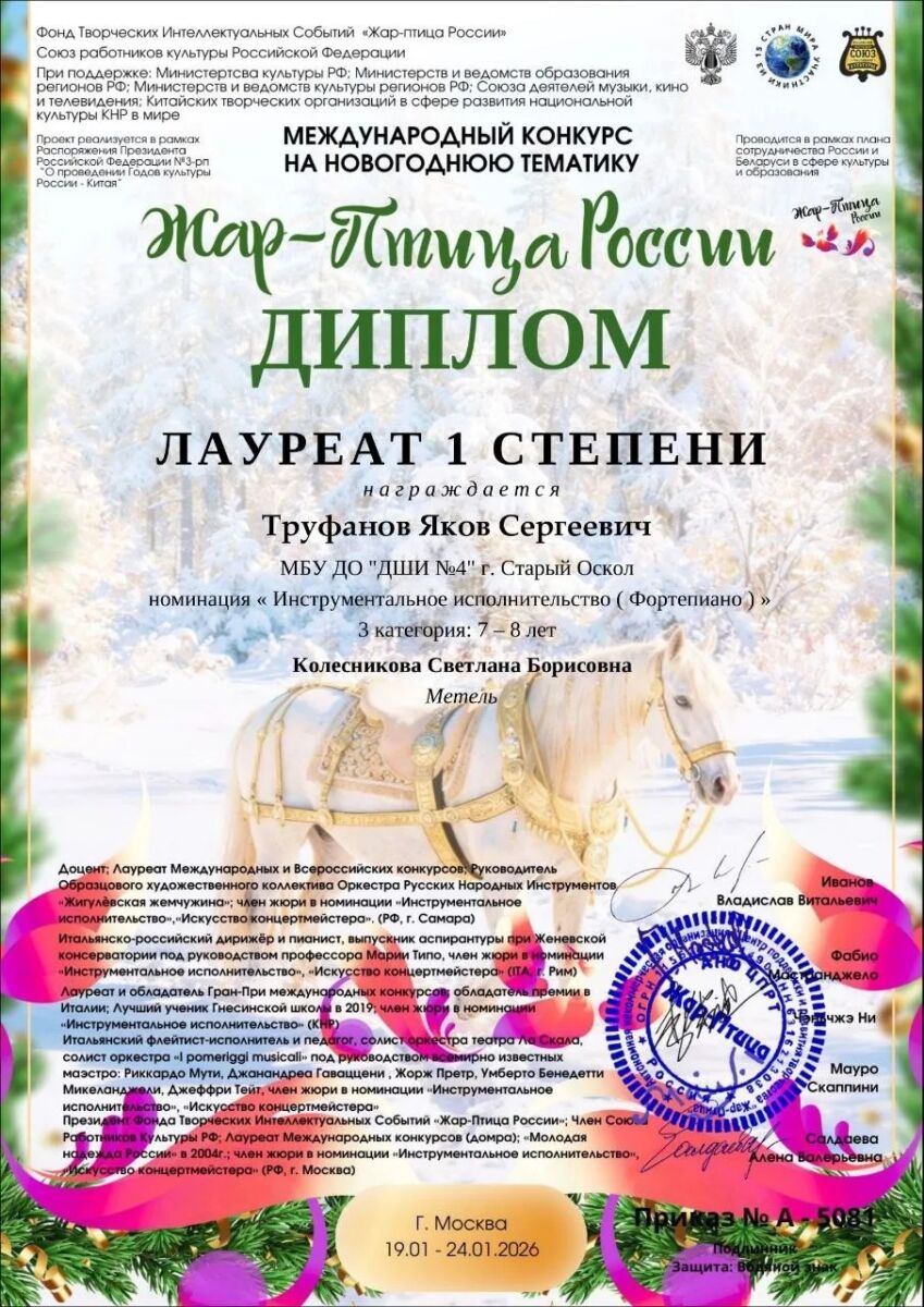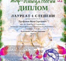 В Москве прошёл Международный конкурс на новогоднюю тематику «Жар-Птица России». От нашей школы в конкурсе принял участие Труфанов Яков. Он получил звание лауреата I степени (преп. Колесникова С. Б.). Кроме того, Колесникова Светлана Борисовна была отмечена Международной премией «Выдающийся руководитель». Поздравляем учащегося и преподавателя с отличным результатом!