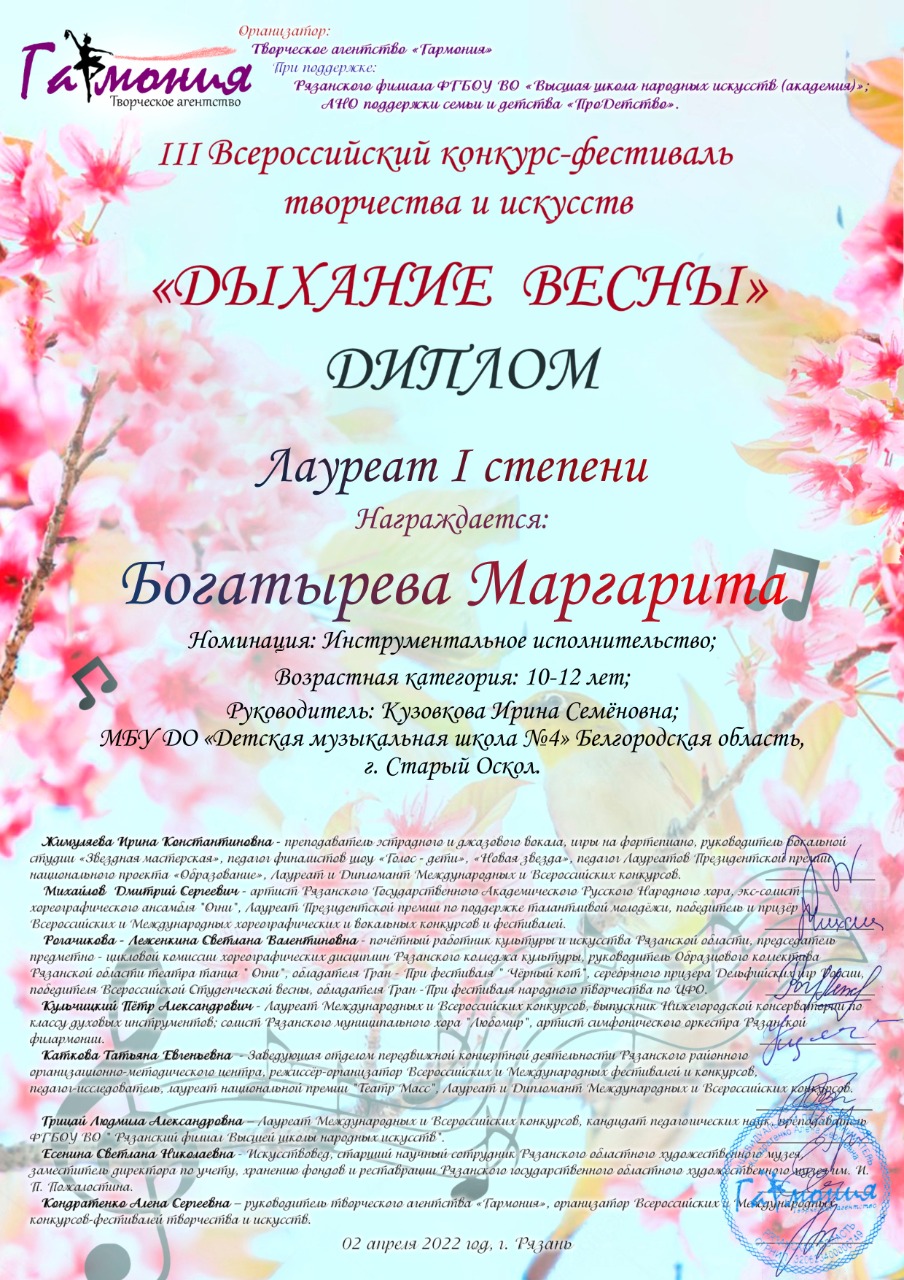 Гран При и Лауреат I степени- Богатырева Маргарита. (Преп. Кузовкова И.С.)