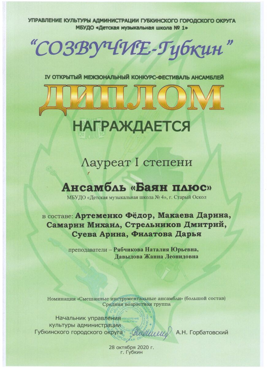 Ансамбль «Баян плюс» Артеменко Фёдор, Макаева Дарина, Самарин Михаил, Стрельников Дмитрий, Суева Арина, Филатова Дарья, преп. Рябчикова Наталия Юрьевна, Давыдова Жанна Леонидовна