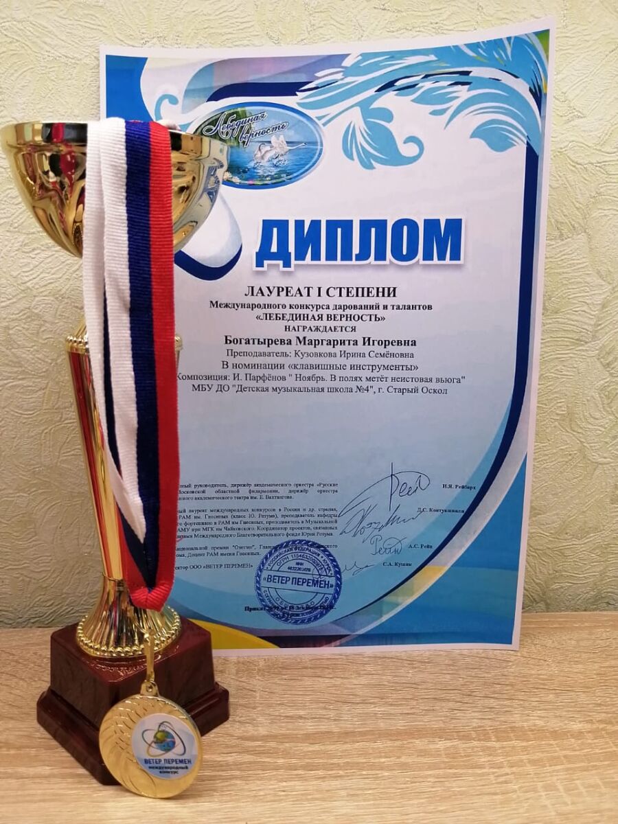 18 декабря 2020 года в городе Курске прошел Международный конкурс дарований и талантов «Лебединая верность». Богатырева Маргарита получила звание Лауреата 1 степени (преп. Кузовкова И. С.)