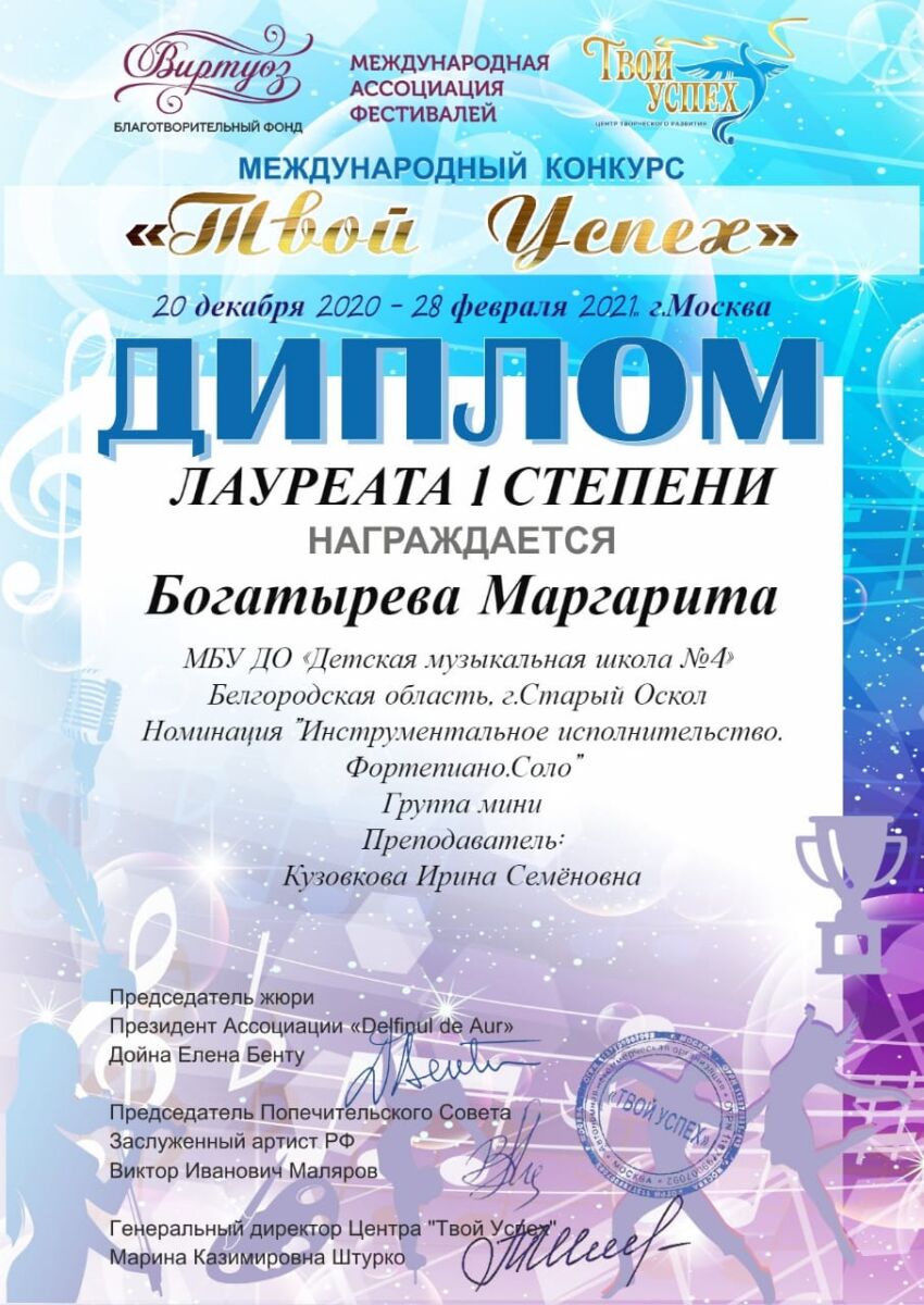 10 января 2021 года в г. Москва прошёл международный конкурс «Твой успех». Поздравляем Богатыреву Маргариту, которая заняла 1 место (преп. Кузовкова И. С.).