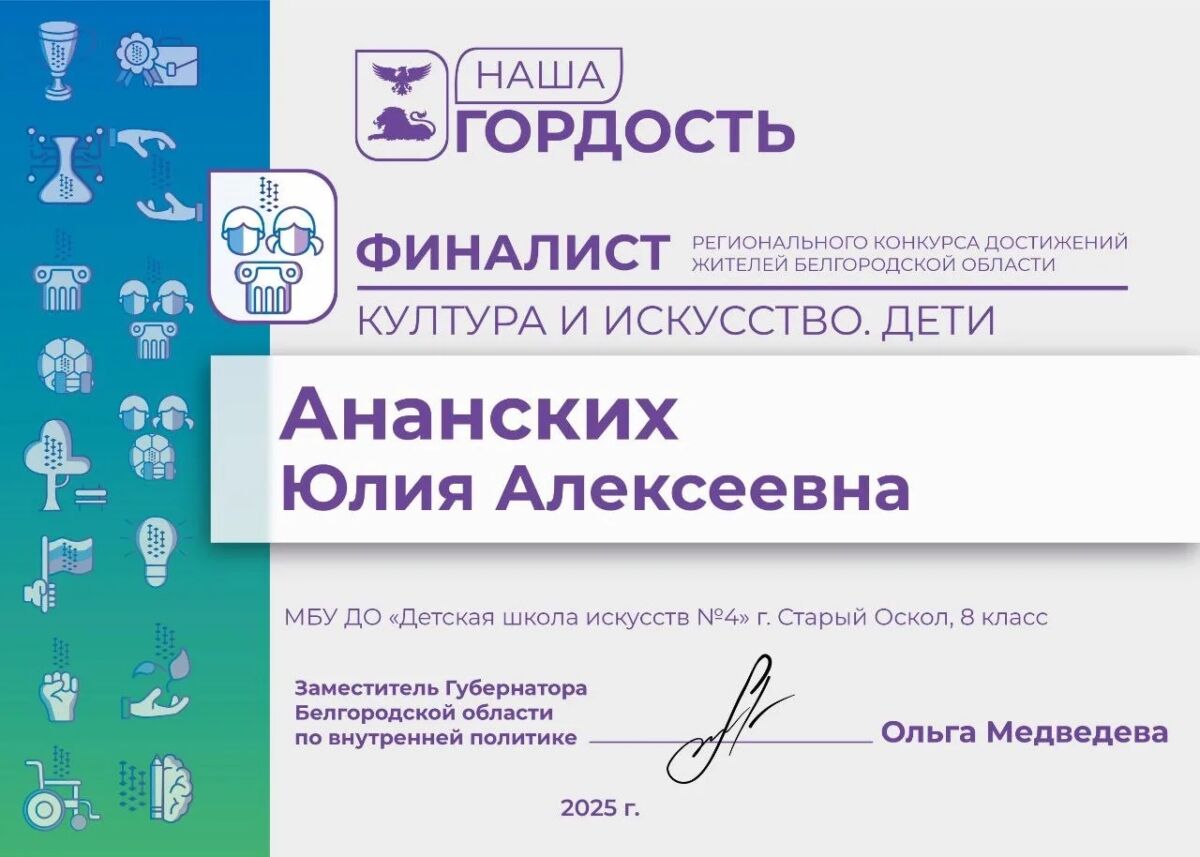 Учащаяся отделения «Клавишных народных инструментов» нашей школы, Юлия Ананских (преп. Рябчикова Н. Ю.), стала финалисткой конкурса в номинации «Культура и искусство. Дети».