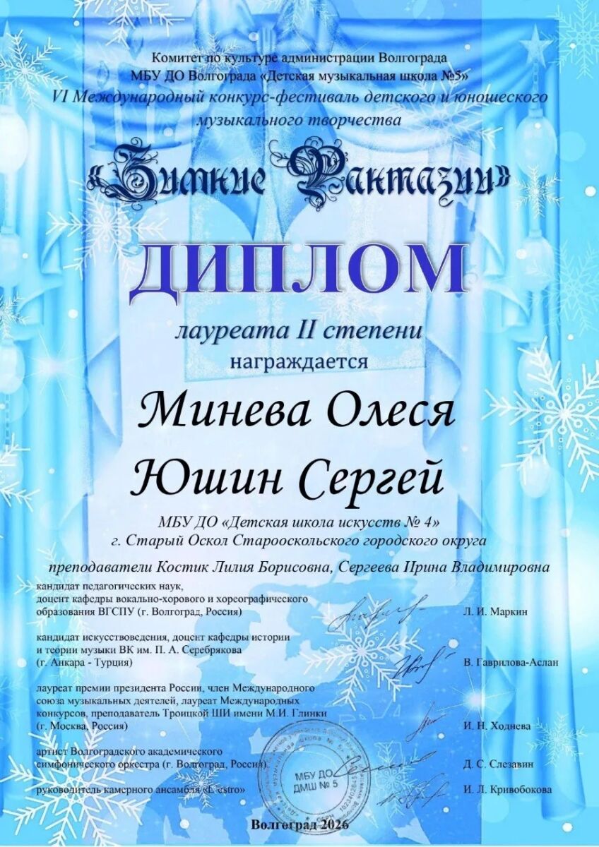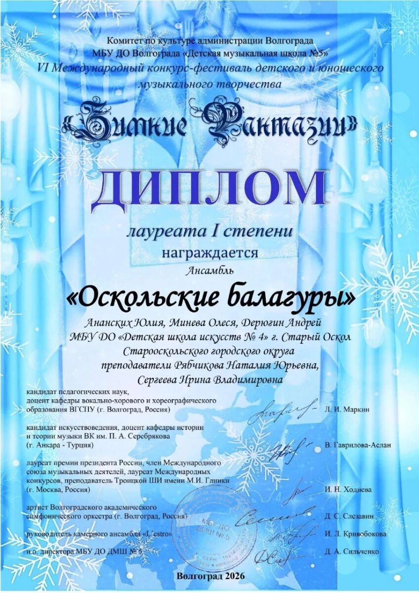 1-3 декабря 2025 года в городе Волгограде прошел VI Международный конкурс-фестиваль детского и юношеского музыкального творчества «Зимние фантазии». Учредитель конкурса — комитет по культуре администрации Волгограда.